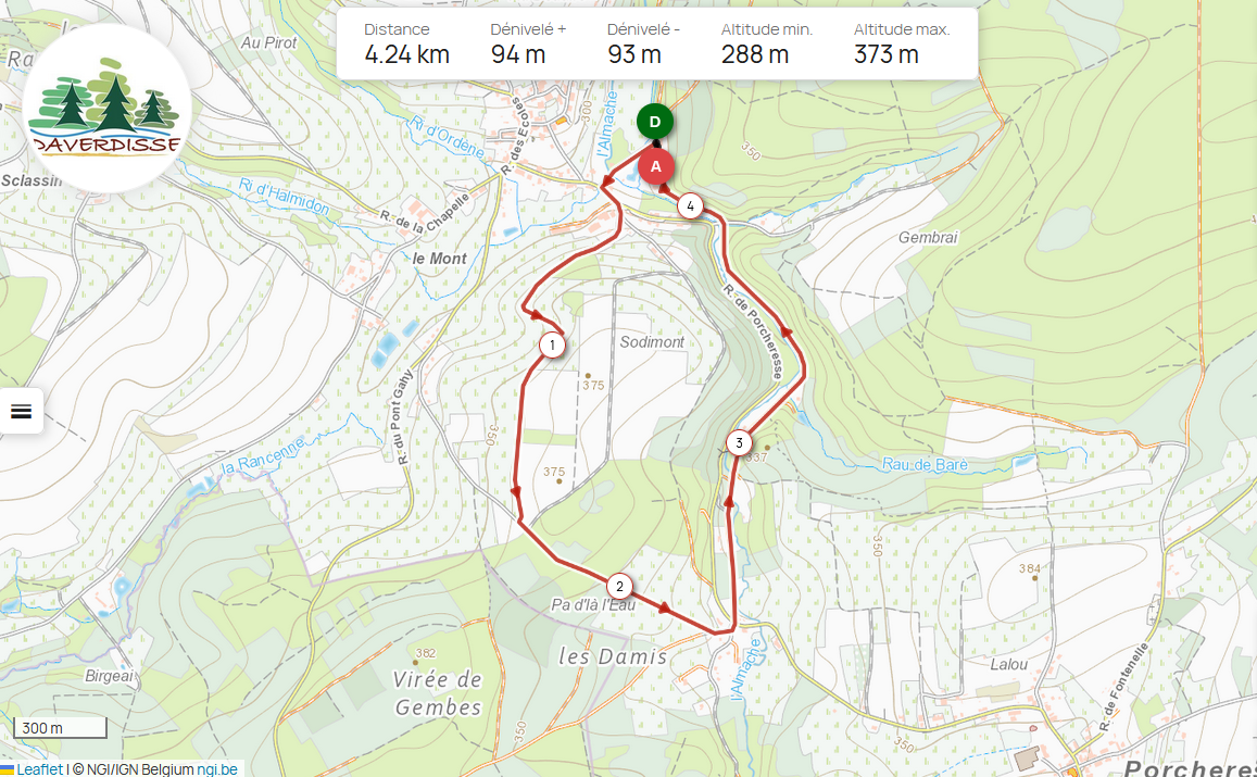 Le chemin entre dans le bois et descend vers Pas d'la l'eau (par delà l'eau), nom que donnent les gens de Porcheresse aux prés et aux bois par delà l'Almache. La promenade revient à Gembes par les bois de la Virée de Sodimont. Cette partie du trajet est commune aux promenades G3 et G4.