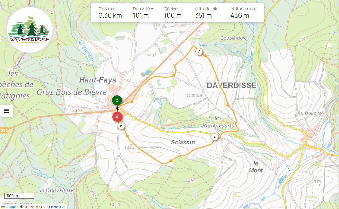 Deux curiosités à Sclassin : les abreuvoirs et la Fontaine d'Halmidon. Le double abreuvoir est appuyé contre un mur de soutènement. La Fontaine d'Halmidon est aménagée de quelques pierres plates et les femmes du Mont allaient y laver leur linge. Retour à Haut-Fays à travers prés et champs.