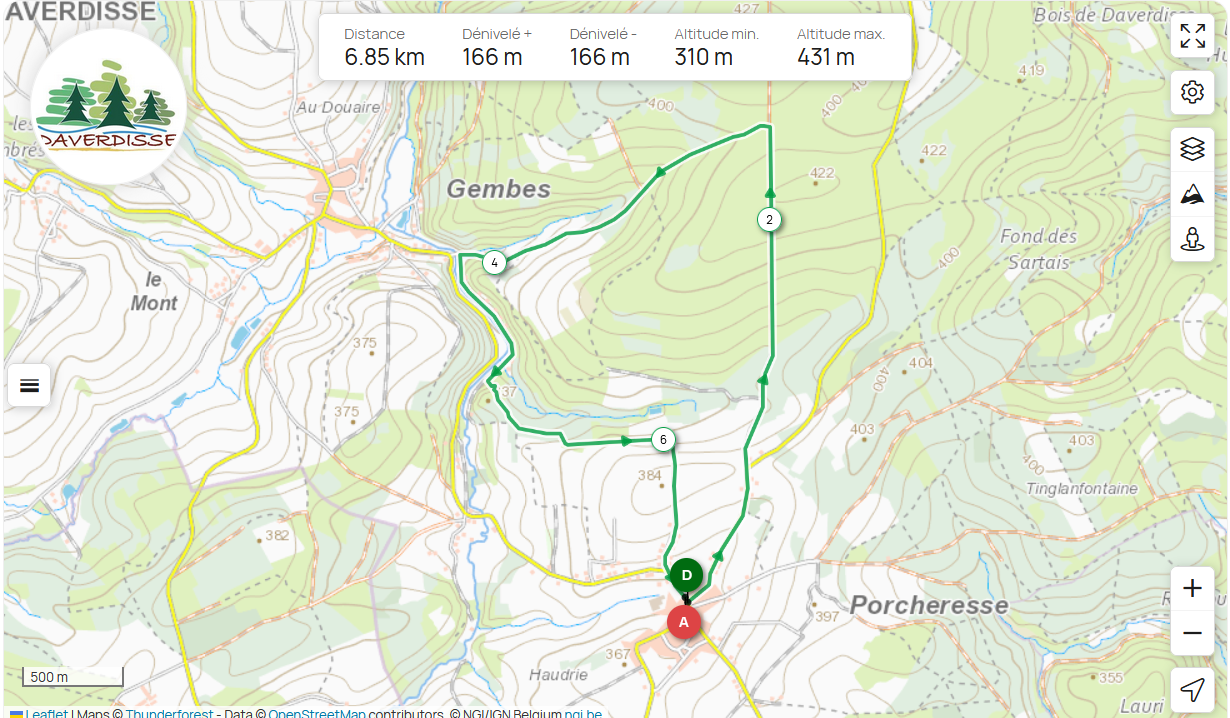 Descente vers de Pont des Gades, à Gembes. Sans franchir le pont, nous remontons la rive droite de l'Almache par la Rwasse d'Our. Nous sommes sur l'ancienne voie du vicinal Wellin-Graide. Quelques mètres en contre-haut subsiste, derrière les maisons, le tracé de l'ancien chemin qui reliait le Pont des Gades à Lalou, au nord de Porcheresse. La Rwasse d'Our connut beaucoup d'activités dans le passé : on y trouve traces d'une carrière, d'une scierie et du « moulin du mortier », une ancienne huilerie. Comme beaucoup de vallées, des prés de fauche étaient irrigués au départ du ruisseau de Barè par des biefs encore décelables sur le terrain, par exemple au pied de la Roche à Mortier, point de vue sur la vallée de l'Almache.